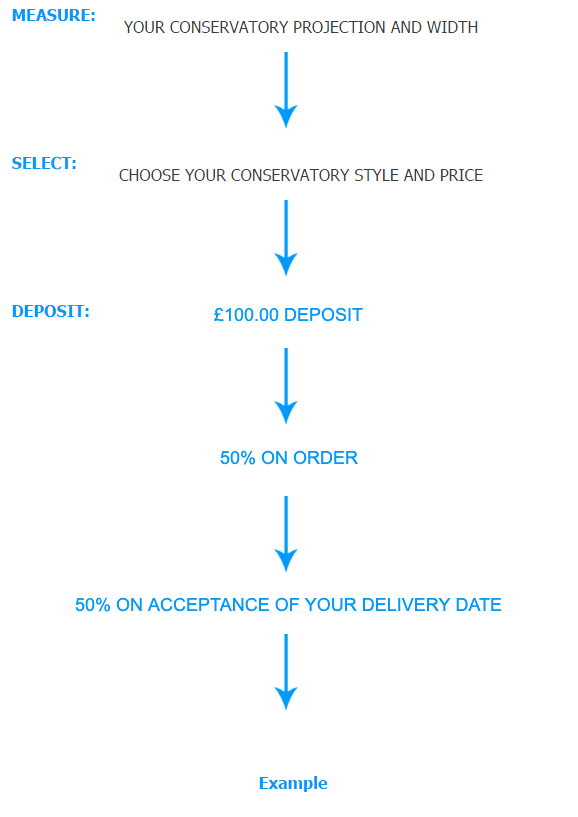 Step 1: £100 deposit. You will then receive your base plans, there is no rush in placing your order for your conservatory, we will hold your price and conservatory until you are ready. Balance remaining £1756.00.